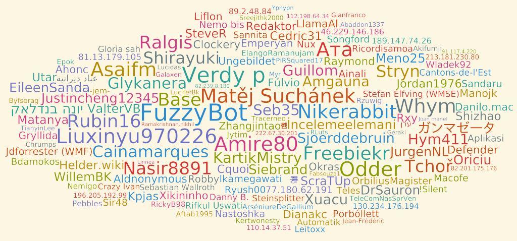| Keywords: Word cloud of Tech News translators.svg tech newsletter as of 2014-07-30 Source data Generated by Tomasz W Kozlowski see below User names are weighted by a function of their number of edits Due to the wide difference in edit counts some names would be huge and others invisible if we used the raw weighting In order to be able to read most names we use edit counts' natural logarithm and add 0 5 so users with only one edit still appear Word cloud generated using http //www wordle net/ Wordle's http //www wordle net/advanced advanced generator by Jonathan Feinberg Due to Wordle's Print function the text was converted to paths and is thus uneditable Color palette http //ethanschoonover com/solarized Solarized by Ethan Schoonover Font Lucida Sans own Guillaume Paumier 2014-07-30 Source data wikitable sortable User Edit count as of 2014-07-30 ln edit count + 0 5 Color hexadecimal - FuzzyBot 3455 8 65 268bd2 - Verdy p 1511 7 82 2aa198 - Odder 936 7 34 859900 - Liuxinyu970226 910 7 31 6c71c4 - Amire80 829 7 22 d33682 - Ата 745 7 11 dc322f - Matěj Suchánek 724 7 08 cb4b16 - Asaifm 693 7 04 b58900 - Whym 686 7 03 657b83 - Nikerabbit 638 6 96 268bd2 - Freebiekr 474 6 66 2aa198 - Base 417 6 53 859900 - Rubin16 406 6 51 6c71c4 - Ralgis 381 6 44 d33682 - Nasir8891 346 6 35 dc322f - Tchoř 295 6 19 cb4b16 - Stryn 250 6 02 b58900 - Shirayuki 242 5 99 657b83 - Cainamarques 212 5 86 268bd2 - Glykanera 174 5 66 2aa198 - KartikMistry 135 5 41 859900 - Seb35 133 5 39 6c71c4 - Guillom 120 5 29 d33682 - Hym411 117 5 26 dc322f - ガンマゼータ 111 5 21 cb4b16 - Amgauna 100 5 11 b58900 - Xuacu 99 5 10 657b83 - Sjoerddebruin 94 5 04 268bd2 - יונה בנד אק 85 4 94 2aa198 - Siebrand 76 4 83 859900 - EileenSanda 71 4 76 6c71c4 - Justincheng12345 71 4 76 d33682 - Oriciu 68 4 72 dc322f - JurgenNL 66 4 69 cb4b16 - İncelemeelemani 62 4 63 b58900 - DrSauron 61 4 61 657b83 - Meno25 57 4 54 268bd2 - ValterVB 52 4 45 2aa198 - WillemBK 50 4 41 859900 - ScraTUp 48 4 37 6c71c4 - Matanya 46 4 33 d33682 - SteveR 44 4 28 dc322f - Cedric31 43 4 26 cb4b16 - Helder wiki 43 4 26 b58900 - Shizhao 42 4 24 657b83 - Kpjas 40 4 19 268bd2 - Utar 40 4 19 2aa198 - Jordan1976 38 4 14 859900 - Cquoi 37 4 11 6c71c4 - Rxy 36 4 08 d33682 - Redaktor 34 4 03 dc322f - Defender 33 4 00 cb4b16 - Dianakc 33 4 00 b58900 - Clockery 32 3 97 657b83 - Aldnonymous 31 3 93 268bd2 - Fúlvio 31 3 93 2aa198 - Raymond 31 3 93 859900 - Ahonc 29 3 87 6c71c4 - Xikininho 29 3 87 d33682 - Liflon 28 3 83 dc322f - LlamaAl 28 3 83 cb4b16 - Manojk 28 3 83 b58900 - Okras 28 3 83 657b83 - Ungebildet 28 3 83 268bd2 - Danilo mac 27 3 80 2aa198 - Zhangjintao 26 3 76 859900 - Emperyan 25 3 72 6c71c4 - Gryllida 25 3 72 d33682 - Ainali 23 3 64 dc322f - Jdforrester WMF 22 3 59 cb4b16 - OrbiliusMagister 22 3 59 b58900 - Robby 22 3 59 657b83 - Ikamegawati 21 3 54 268bd2 - Sandaru 21 3 54 2aa198 - Macofe 20 3 50 859900 - Nastoshka 20 3 50 6c71c4 - Nemo bis 20 3 50 d33682 - Nux 20 3 50 dc322f - Porbóllett 20 3 50 cb4b16 - Sir48 20 3 50 b58900 - Aplikasi 19 3 44 657b83 - Ryush00 19 3 44 268bd2 - Songford 19 3 44 2aa198 - Bdamokos 18 3 39 859900 - 77 180 62 191 17 3 33 6c71c4 - Wladek92 17 3 33 d33682 - Ricordisamoa 16 3 27 dc322f - Sannita 16 3 27 cb4b16 - Teles 16 3 27 b58900 - عباد ديرانية 16 3 27 657b83 - Cantons-de-l'Est 15 3 21 268bd2 - Rifkul Uswati 15 3 21 2aa198 - Silent 15 3 21 859900 - 81 13 179 105 14 3 14 6c71c4 - Danny B 14 3 14 d33682 - Stefan Elfving WMSE 14 3 14 dc322f - Steinsplitter 14 3 14 cb4b16 - Automatik 13 3 06 b58900 - Gloria sah 13 3 06 657b83 - Leitoxx 13 3 06 268bd2 - 189 147 74 26 12 2 98 2aa198 - Jytim 12 2 98 859900 - 콩 루 11 2 90 6c71c4 - 46 229 146 186 11 2 90 d33682 - 89 2 48 84 11 2 90 dc322f - Crazy Ivan 11 2 90 cb4b16 - -jem- 11 2 90 b58900 - Sebastian Wallroth 11 2 90 657b83 - 130 234 176 194 10 2 80 268bd2 - ElangoRamanujam 10 2 80 2aa198 - Nemigo 10 2 80 859900 - Pebbles 10 2 80 6c71c4 - RickyB98 9 2 70 d33682 - ערן 9 2 70 dc322f - 림 8 2 58 cb4b16 - Aftab1995 8 2 58 b58900 - Akifumii 8 2 58 657b83 - ArséniureDeGallium 8 2 58 268bd2 - Epok 8 2 58 2aa198 - Kertwonesty 8 2 58 859900 - Rzuwig 8 2 58 6c71c4 - 110 14 37 51 7 2 45 d33682 - 196 205 192 99 7 2 45 dc322f - 213 181 230 80 7 2 45 cb4b16 - Byfserag 7 2 45 b58900 - Chrumps 7 2 45 657b83 - PiRSquared17 7 2 45 268bd2 - TeleComNasSprVen 7 2 45 2aa198 - Tracerneo 7 2 45 859900 - Abaddon1337 6 2 29 6c71c4 - Galaxen 6 2 29 d33682 - Gianfranco 6 2 29 dc322f - Jean-Frédéric 6 2 29 cb4b16 - Lucifer8k 6 2 29 b58900 - Lucioas 6 2 29 657b83 - Myr 6 2 29 268bd2 - RLuts 6 2 29 2aa198 - Sreejithk2000 6 2 29 859900 - TianyinLee 6 2 29 6c71c4 - 112 198 64 34 5 2 11 d33682 - 222 67 30 201 5 2 11 dc322f - 82 201 175 176 5 2 11 cb4b16 - Fabsouza1 5 2 11 b58900 - Geraki 5 2 11 657b83 - Ypnypn 5 2 11 268bd2 - 82 239 8 180 4 1 89 2aa198 - 91 117 4 220 4 1 89 859900 - Joan manel 4 1 89 6c71c4 - Linnea 4 1 89 d33682 - Ramakrishnan nikhil 4 1 89 dc322f - Sergento 4 1 89 cb4b16 - Shangkuanlc 4 1 89 b58900 - Tuankiet65 4 1 89 657b83 - קובי כרמ 4 1 89 268bd2 - 111 161 97 254 3 1 60 2aa198 - 151 67 117 52 3 1 60 859900 - 177 148 217 222 3 1 60 6c71c4 - 190 100 56 220 3 1 60 d33682 - 5 54 40 131 3 1 60 dc322f - Amgr 88 3 1 60 cb4b16 - Cekli829 3 1 60 b58900 - Chelin 3 1 60 657b83 - Dobosattilasandor 3 1 60 268bd2 - Lvova 3 1 60 2aa198 - V narsikar 3 1 60 859900 - Vogone 3 1 60 6c71c4 - Xcodexif 3 1 60 d33682 - Zetud 3 1 60 dc322f - Zwiadowca21 3 1 60 cb4b16 - 201 29 180 215 2 1 19 b58900 - 91 196 53 134 2 1 19 657b83 - Abelpadilla 2 1 19 268bd2 - Bjankuloski06 2 1 19 2aa198 - Cwek 2 1 19 859900 - Dzięcioł 3 2 1 19 6c71c4 - Epescopo 2 1 19 d33682 - Liangent 2 1 19 dc322f - Nuriaballtor 2 1 19 cb4b16 - Putnik 2 1 19 b58900 - Takot 2 1 19 657b83 - UsmanPathanKhan 2 1 19 268bd2 - Uziel302 2 1 19 2aa198 - Zerabat 2 1 19 859900 - Zhaofeng Li 2 1 19 6c71c4 - 114 130 28 26 1 0 50 d33682 - 114 187 115 58 1 0 50 dc322f - 176 11 53 141 1 0 50 cb4b16 - 178 2 17 122 1 0 50 b589