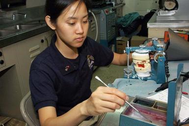 Keywords: Working on dentures DVIDS109480.jpg en University of California at San Diego student Thien-Kim Le from San Diego Calif representing the UCSD Pre-Dental Society uses wax for tooth placement on a set of dentures for a patient while aboard the Military Sealift Command hospital ship USNS Mercy during Pacific Partnership 2008 Mercy is the primary platform for Pacific Partnership a four-month humanitarian mission providing engineering civic medical and dental assistance to Southeast Asia and Oceania 2008-08-16 https //www dvidshub net/image/109480 080816-N-+++++-025 2008-08-19 04 27 PORT MORESBY PG PD-USGov-Military-Navy USNS Mercy T-AH-19 Pacific Partnership 2008 Images from DoD uploaded by Fæ |