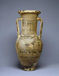 Keywords: Workshop of Athens 894 - Amphora with Funerary Scenes - Walters 482231 - Profile.jpg An amphora is a two-handled vessel used to store wine oil honey or grain Vases such as this one however were made to be buried in tombs and depict moments in the funerary ritual On the neck the deceased is laid out on the funeral bier with the checkered shroud raised to reveal the body The couch is surrounded by women who tear at their hair in grief Around the body of the vase a procession of chariots and warriors moves to the right A narrow band of running dogs appears above and a band of grazing deer below Clay snakes were modeled separately and applied to the mouth handles and shoulder of the vase emphasizing their funerary role as guardians of tombs between 720 710 BC Geometric terracotta cm 51 2 24 h x diam accession number 48 2231 9982 Lagunillas Havana 1956 Ars Antiqua Auction Lucerne 1961 Walters Art Museum 1961 by purchase William H Schab New York as agent Museum purchase 1961 In Search of Ancient Treasure 40 Years of Collecting The Walters Art Gallery Baltimore 1978 place of origin Athens Greece Walters Art Museum license Ancient Greek pottery in the Walters Art Museum Media contributed by the Walters Art Museum needs category review Workshop of Athens 894 Ancient Greek Neck amphoras |