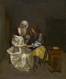 | Keywords: Workshop of Gerard Terborch II - A Glass Of Lemonade - Walters 37341 (2).jpg  By the mid-1600s the intimate lives of the middle class joined the raucous lives of the poor as subjects for painting Here an attentive young man tenderly mixes a restorative glass of lemonade for the young woman presumably to convey his own feelings to the love-sick young woman under the watchful eyes of a chaperon Ter Borch was a talented portraitist as well as painter of interiors with figures in satins and other rich fabrics although the effect is diminished here by an over cleaning of the surface decades ago The models for the young people were the artist's half sister and brother Gersina and Moses who were also painters A first version of this composition was painted around 1663 With the assistance of his workshop Ter Borch then made additional versions with small variations between 1666 1668 Baroque Oil on canvas cm 73 7 61 6 accession number 37 341 26676 Charles T Yerkes date and mode of acquisition unknown Charles T Yerkes Sale American Art Association New York 1910 no 134 Henry Walters city Baltimore Walters Art Museum Henry Walters Acquired by Henry Walters 1910 place of origin Netherlands <gallery> File Workshop of Gerard Terborch II - A Glass Of Lemonade - Walters 37341 jpg </gallery> Walters Art Museum license 2D Paintings in the Walters Art Museum Baroque paintings in the Walters Art Museum Media contributed by the Walters Art Museum needs category review The Glass of Lemonade by Gerard ter Borch II  |