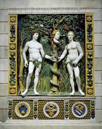 | Keywords: Workshop of Giovanni della Robbia - Adam and Eve - Walters 27219 - Front Installation.jpg The first two humans are depicted with ideal bodies that recall ancient marble sculptures The snake has a woman's face that resembles Eve's During this period women were often described as untrustworthy and this negative idea is reflected in the gender of the face of the snake The inscription on the base indicates that this is one of the many works of art made in Florence to celebrate the triumphal entrance of Pope Leo X a member of Florence's Medici family into the city on November 30 1515 The central coat of arms is the pope's To the right is that of the Salviati family and to the left is that of the Buondelmonti family demonstrating their support of the pope For several generations the artists of the Della Robbia family in Florence were noted for the production of brightly colored glazed terracottas often produced for architectural settings 1515 Renaissance terracotta with glaze cm 279 5 212 accession number 27 219 35961 Henry Walters Baltimore 1902 mode of acquisition unknown Walters Art Museum Henry Walters Acquired by Henry Walters 1902 place of origin Florence Italy Walters Art Museum license Italian Renaissance maiolica in the Walters Art Museum Media from the Walters Art Museum no creator template Giovanni della Robbia Coats of arms of the House of Buondelmonti Coats of arms of the House of Salviati Leo X Reliefs of Temptation of Adam and Eve |