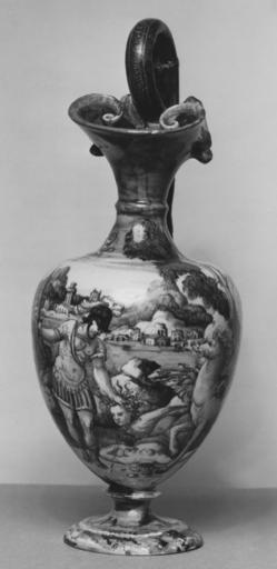 | Keywords: Workshop of Guido Durantino - Ewer with Perseus Holding the Head of Medusa - Walters 481511 - Side B.jpg This fine ewer or pitcher would have been placed on a matching basin for washing one's hands or face bearing the same unidentified coat of arms Given how easily earthenware is broken it is not surprising that the basin is lost; few complete sets survive The Greek hero Perseus stands before a serene landscape holding the severed head of the feared Gorgon Medusa a female monster with snakes for hair Perseus accepted the challenge of slaying her in order to save his mother from a forced marriage ca 1550 1560 Renaissance earthenware with tin glaze maiolica cm 34 3 14 2 accession number 48 1511 33939 G H Morland before 1862 by purchase Octavius E Coope Brentwood Essex 1866 by purchase Sale Christie's London May 3 1910 no 28 Jacques Seligmann Paris by purchase Henry Walters city Baltimore Walters Art Museum Henry Walters Acquired by Henry Walters 1910 initials place of origin Urbino Italy Walters Art Museum license Italian Renaissance maiolica in the Walters Art Museum Guido Durantino Media contributed by the Walters Art Museum needs category review |
