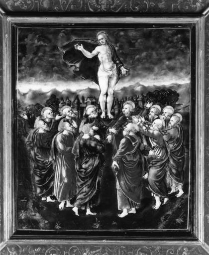 | Keywords: Workshop of the Pénicaud family - The Ascension - Walters 4461.jpg The subject may represent the Ascension in the spirit an appearance of Christ to his disciples during his supernatural life after the Resurrection Christ is represented nude clad only in a loincloth and a flowing mantle and showing his wounds The twelve apostles who manifest various expressions of astonishment and rapture are distinguished only by their age They bear no attributes In the background one sees a town and a mountain ridge The figure of Christ seems to have been inspired by that in a painting The Doubting Thomas executed in 1551 by Léonard Limosin for the church of Saint-Pierre-du-Queyroix in Limoges Today this is in the museum at Limoges and was restored in 1963 On the other hand Léonard Limosin may have used for his painting a figure of Christ designed by Jean Pénicaud II for his workshop between 1560 1600 late Renaissance technique painted enamel gold copper cm 20 6 17 4 accession number 44 61 2909 F Spitzer Collection Sale Paris April 17 1893 lot 432 Henry Walters Baltimore date and mode of acquisition unknown Walters Art Museum Henry Walters Acquired by Henry Walters Lost and Found The Secrets of Archimedes The Walters Art Museum Baltimore 2011-2012 place of origin Limoges France Walters Art Museum license Limoges painted enamels in the Walters Art Museum Painted enamel art in the Walters Art Museum Pénicaud family workshop Spitzer Collection Paintings of the Ascension of Christ Loincloths in art |