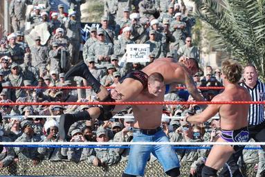 Keywords: World Wrestling Entertainment wrestles way to Victory DVIDS134445.jpg en World Wrestling Entertainment Inc superstar John Cena slams Randy Orton during the WWE's Tribute to the Troops as Multi-National Division “ Baghdad and 4th Infantry Division Soldiers enjoy the show which was held in front of the Al Faw Palace on Camp Victory Dec 5 The event marks the sixth year in a row that WWE superstars have come to entertain U S troops stationed on the front lines in Iraq 2008-12-05 Staff Sgt Daleanne Maxwell https //www dvidshub net/image/134445 134445 2008-12-08 11 09 BAGHDAD IQ PD-USGov Camp Victory Al-Faw Palace Images from DoD uploaded by Fæ |