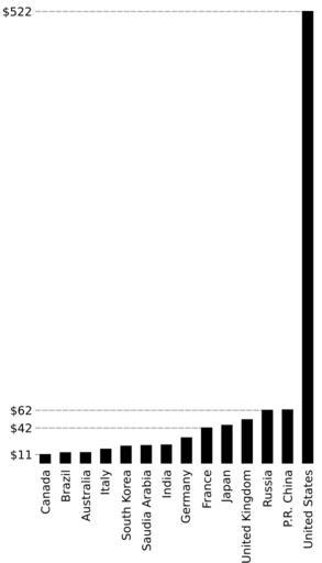 | Keywords: Worldwide military spending 2005.svg Graphic showing the top 14 worldwide military budgets sorted by country the top 14 cover all countries who spent more than 10 billion on their military in USD billions Data for P R China and Russia is from 2004 expenditures Expenditures are used in a few cases where official budgets are significantly lower than actual spending Data source http //www armscontrolcenter org/archives/002244 php Center for Arms Control and Non-Proliferation Created by User Fastfission using a combination of Microsoft Excel to get the bars the right length then exported to Illustrator and then re-designed in Inkscape Not all exact values are shown the goal of the graphic is to show relative amounts and not just duplicate what could otherwise more easily go into a table I've arranged it vertically in order to best work with Wikipedia page layout I've tried to keep things pretty simple following the graphical recommendations that Edward Tufte has written about Enlarged <br/> 300px Fastfission If you want to credit someone credit Wikimedia Commons Otherwise don't credit anyone that's fine by me --Fastfission 15 06 14 April 2008 UTC Military diagrams |