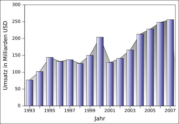 | Keywords: Worldwide Semiconductor Sales in US-Dollar DE.SVG en Worldwide Sales of Semiconductors in Billion USD 1993-2007 Data Semiconductor Equipment and Materials International SEMI de Weltweite Umsätze mit Halbleitern in Milliarden US-Dollar 1993-2007 Daten Semiconductor Equipment and Materials International SEMI Worldwide_Semiconductor_Sales_in_Billion_US-Dollar_GERMAN jpg 2009-05-24 17 44 UTC Worldwide_Semiconductor_Sales_in_Billion_US-Dollar_GERMAN jpg Swettengl derivative work Cepheiden <span class signature-talk >talk</span> SVG conversion Cepheiden Worldwide_Semiconductor_Sales_in_Billion_US-Dollar_GERMAN jpg Data Diagram was made with gnumeric by using following data <pre> Jahr Umsatz in Milliarden USD 1993 77 1994 102 1995 144 1996 132 1997 137 1998 126 1999 150 2000 204 2001 129 2002 141 2003 166 2004 213 2005 228 2006 248 2007 256 </pre> de Weltweite Umsätze mit Halbleitern in Milliarden US-Dolla</nowiki> Uploaded with derivativeFX Semiconductors Sales |