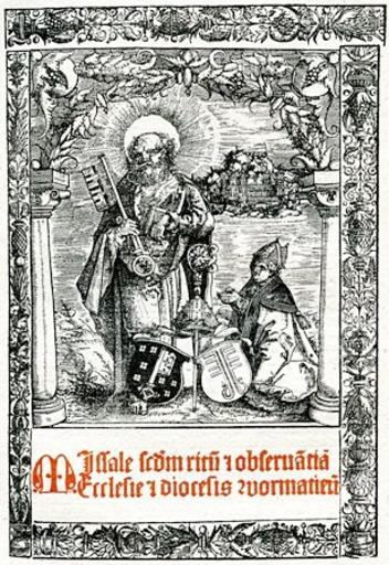 | Keywords: Wormser Missale 1a.jpg en Titelblatt des Wormser Missale von 1522 mit Bischof Reinhard von Rüppurr + 1523 und seinem Familienwappen rechts 1522 Historische Webseite Wormser Dom http //dombauverein-worms de/dom-zu-worms/der-dom-in-alten-ansichten/liturgische-buecher/index php zeitgenössischer Stecher 1522 other versions PD-old-70-1923 Uploaded with UploadWizard Bishopric of Worms Coats of arms of Rüppurr family Missals | ||||