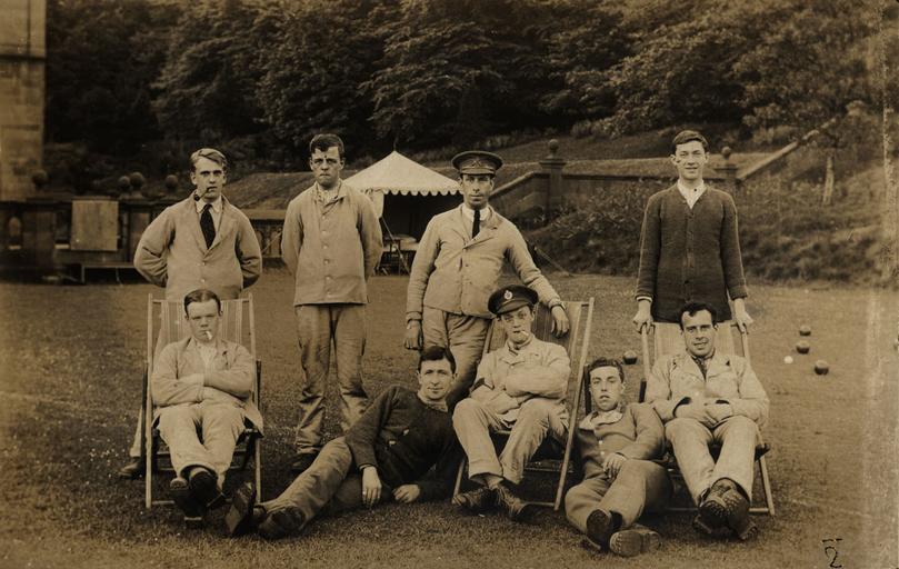 | Keywords: soldiers first world war firstworldwar bowls deckchairs monochrome outdoor This is a photograph of patients at Longshaw Lodge Convalescent Home for Wounded Soldiers, Grindleford, near Sheffield.  Reference: DF.BGS-4-9-5  The photograph is part of a larger collection that offers a rare and intimate glimpse in to the Life of a Wounded Soldier recovering from the horrors of World War One.  This particular set of photographs is taken from a collection held at Tyne & Wear Archives capturing the every day lives of the nurses and patients at the 3rd Northern General Hospital, Sheffield and Longshaw Lodge Convalescent Home for Wounded Soldiers, Grindleford, near Sheffield. The photographs were taken between August 1916 and June 1917.  A blog about this fascinating collection can been viewed here on the Tyne & Wear Archives & Museums website.  (Copyright) We're happy for you to share these digital images within the spirit of The Commons. Please cite 'Tyne & Wear Archives & Museums' when reusing. Certain restrictions on high quality reproductions and commercial use of the original physical version apply though; if you're unsure please email archives@twmuseums.org.uk  This is a photograph of patients at Longshaw Lodge Convalescent Home for Wounded Soldiers, Grindleford, near Sheffield.  Reference: DF.BGS-4-9-5  The photograph is part of a larger collection that offers a rare and intimate glimpse in to the Life of a Wounded Soldier recovering from the horrors of World War One.  This particular set of photographs is taken from a collection held at Tyne & Wear Archives capturing the every day lives of the nurses and patients at the 3rd Northern General Hospital, Sheffield and Longshaw Lodge Convalescent Home for Wounded Soldiers, Grindleford, near Sheffield. The photographs were taken between August 1916 and June 1917.  A blog about this fascinating collection can been viewed here on the Tyne & Wear Archives & Museums website.  (Copyright) We're happy for you to share these digital images within the spirit of The Commons. Please cite 'Tyne & Wear Archives & Museums' when reusing. Certain restrictions on high quality reproductions and commercial use of the original physical version apply though; if you're unsure please email archives@twmuseums.org.uk |