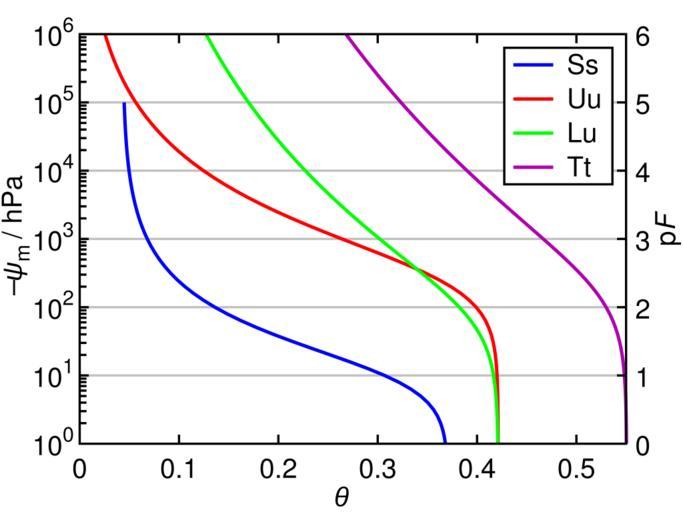 Keywords: Wrc.svg en calculated diagram of soil with model formula van Genuchten 1980 <ref> cite web https //www bgr bund de/DE/Themen/Boden/Netzwerke/Adhocag/Downloads/Ergaenzungsregel_1_18 pdf Verknüpfungsregel 1 18 “ Parameter für das Modell einer stetigen Funktion der θ ψ -Beziehung 2015-07-29 Ad-hoc-AG Boden 2004-09-17 PDF 242 KiB Staatlichen Geologischen Dienste und BGR German </ref> de neu berechnetes Diagramm verschiedener Bodenarten mit Modelldaten gemäß van Genuchten 1980 own FMoeckel DufterKunde 2015-08-13 http //de wikipedia org/wiki/Datei Wrc svg Wrc jpg o Van Genuchten model of soil water retention <math>\theta</math> “ relative soil water content <math>\Psi_ \mathrm m </math> “ soil matric potential <math> \theta \theta_r + \frac \theta_s - \theta_r \left 1 + \left \alpha\ \frac \left \Psi_ \mathrm m \right \mathrm hPa \right n \right m </math> with <math> m 1 - \frac 1 n \; </math> 1 cellpadding 1 cellspacing 0 +Parameter List Soil Soil <math>\theta_r</math> <math>\theta_r</math> <math>\alpha</math> <math>n</math> <math>m</math> - Ss Sand 0 043019 0 370687 0 087424 1 57535 0 36522 - Uu Silt 0 0 421256 0 003405 1 34475 0 25637 - Lu Loam-Silt 0 0 421217 0 013345 1 12614 0 11201 - Tt Clay 0 0 550541 0 006812 1 08155 0 07540 GNU Octave source code <syntaxhighlight lang octave> function van_genuchten Encdoing UTF-8 Written by DufterKunde https //de wikipedia org/wiki/Benutzer DufterKunde to produce a corrected version of https //commons wikimedia org/wiki/File Wrc svg It is supposed to be run in GNU octave 4 0 but it should also work with older versions of octave as well Only minor changes are needed to make it run with Matlab The plot shows the matric potential Psi_m of different types of soil as a function of the relative soil water content theta It is based on the equation and parameters from cite web https //www bgr bund de/DE/Themen/Boden/Netzwerke/Adhocag/Downloads/Ergaenzungsregel_1_18 pdf Verknüpfungsregel 1 18 “ Parameter für das Modell einer stetigen Funktion der θ ψ -Beziehung 2015-07-29 Ad-hoc-AG Boden 2004-09-17 PDF 242 KiB Staatlichen Geologischen Dienste und BGR German theta theta_r + theta_s - theta_r / 1 + alpha -psi n m with m 1 - 1/n Ss Sand Uu Silt Lu Loam-Silt Tt Clay Compliance of the output with the svg-standard validated by https //validator w3 org/ and practical functionality tested with - Mozilla Firefox for Ubuntu 40 0 - Chromium 43 0 2357 130 Ubuntu 15 04 64-bit - eog Eye of Gnome 3 14 4 - Inkscape 0 91 r13725 and - SVG Check https //tools wmflabs org/svgcheck/ rsvg 2 36 1 parameters pF 0 6; N 10 diff pF + 1; psi -logspace pF 1 pF 2 N ; x 0 0 55; y pF; X 70 550 ; Y 390 30 ; DY diff Y /diff y ; Tick 8; tick 6; lgnd_wdth 95; lgnd_hght 120; lgnd_strk 35; lgnd_pad 4; lgnd_Pad 12; today clock ; Sand theta_r_ss 0 043019; theta_s_ss 0 370687; alpha_ss 0 087424; n_ss 1 57535; theta_ss theta_vg psi theta_r_ss theta_s_ss alpha_ss n_ss ; Silt theta_r_uu 0; theta_s_uu 0 421256; alpha_uu 0 003405; n_uu 1 34475; theta_uu theta_vg psi theta_r_uu theta_s_uu alpha_uu n_uu ; Loam-Silt theta_r_lu 0; theta_s_lu 0 421217; alpha_lu 0 013345; n_lu 1 12614; theta_lu theta_vg psi theta_r_lu theta_s_lu alpha_lu n_lu ; Clay theta_r_tt 0; theta_s_tt 0 550541; alpha_tt 0 006812; n_tt 1 08155; theta_tt theta_vg psi theta_r_tt theta_s_tt alpha_tt n_tt ; generate svg-file fid fopen Wrc svg w ; fprintf fid < xml version \ 1 0\ encoding \ utf-8\ >\n <svg\n xmlns \ http //www w3 org/2000/svg\ \n width \ 600\ height \ 450\ \n >\n \t<title>Water Retention Curves</title>\n ; fprintf fid \t<desc>\n \t\t This is a corrected version of\n \t\t https //commons wikimedia org/wiki/File Wrc svg\n \t\t generated by DufterKunde\n \t\t https //de wikipedia org/wiki/Benutzer DufterKunde\n \t\t on i- 02i- 02i \n \t\t The plot shows the matric potential Psi_m\n \t\t of different types of soil as a function of the\n \t\t relative soil water content theta \n \t\t It is based on the equation and parameters from\n \t\t cite web\n \t\t https //www bgr bund de/DE/Themen/Boden/Netzwerke/Adhocag/Downloads/Ergaenzungsregel_1_18 pdf\n \t\t Verknüpfungsregel 1 18 “ Parameter für das Modell einer stetigen Funktion der θ ψ -Beziehung\n \t\t 2015-07-29\n \t\t Ad-hoc-AG Boden\n \t\t \n \t\t 2004-09-17\n \t\t PDF 242 KiB\n \t\t Staatlichen Geologischen Dienste und BGR\n \t\t German\n \t\t \n \t\t theta theta_r + theta_s - theta_r / 1 + alpha -psi n m\n \t\t with\n \t\t m 1 - 1/n \n \t\t Ss Sand Uu Silt Lu Loam-Silt Tt Clay \n \t\t This svg-file has been generated line-by-line\n \t\t by a GNU Octave function \n \t\t Compliance with the svg standard validated by \n \t\t https //validator w3 org/\n \t\t and practical functionality tested with\n \t\t - Mozilla Firefox for Ubuntu 40 0 \n \t\t - Chromium 43 0 2357 130 Ubuntu 15 04 64-bit \n \t\t - eog Eye of Gnome 3 14 4 \n \t\t - Inkscape 0 91 r13725 and\n \t\t - SVG Check https //tools wmflabs org/svgcheck/ rsvg 2 36 1 \n \t</desc>\n today 1 today 2 today 3 ; fprintf fid \t<g shape-rendering \ geometricPrecision\ stroke \ black\ stroke-width \ 2\ >\n ; fprintf fid \t\t\n ; fprintf fid \t\t<g stroke \ c0c0c0\ >\n ; for k pF 1 + 1 pF 2 - 1 Y_grid Y 1 + k DY fprintf fid \t\t\t<polyline points \ i i i i\ />\n X 1 Y_grid X 2 Y_grid ; endfor fprintf fid \t\t</g>\n ; fprintf fid \t\t\n ; fprintf fid \t\t<g fill \ none\ stroke-width \ 3\ >\n ; write_svg_dat fid psi 1 end-10 theta_ss 1 end-10 x y X Y 0000ff Ss Sand ; write_svg_dat fid psi theta_uu x y X Y ff0000 Uu Silt ; write_svg_dat fid psi theta_lu x y X Y 00ff00 Lu Loam-Silt ; write_svg_dat fid psi theta_tt x y X Y b000b0 Tt Clay ; fprintf fid \t\t</g>\n ; fprintf fid \t\t\n ; for k 0 1 0 1 0 5 X_grid X 1 + k diff X /diff x fprintf fid \t\t<polyline points \ 5 2f i 5 2f i\ />\n X_grid Y 1 X_grid Y 1 -Tick ; fprintf fid \t\t<polyline points \ 5 2f i 5 2f i\ />\n X_grid Y 2 +Tick X_grid Y 2 ; endfor fprintf fid \t\t\n ; for k pF 1 + 1 pF 2 - 1 Y_grid Y 1 + k DY; fprintf fid \t\t<polyline points \ i i 