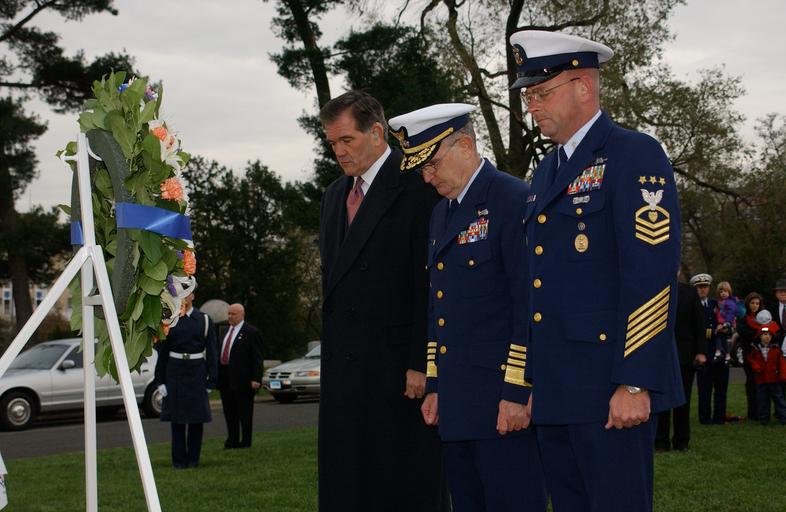 | Keywords: WREATH LAYING CEREMONY DVIDS1075050.jpg en ARLINGTON Va Nov 11 2003 --Department of Homeland Security Secretary Tom Ridge Coast Guard Commandant Adm Thomas H Collins and Master Chief Petty Officer of the Coast Guard Frank Welch render a moment of silence today at Coast Guard Memorial during a Veteran's Day Wreath Laying Ceremony held on Arlington National Cemetery USCG photo by Telfair H Brown Sr Unit U S Coast Guard District 5 DVIDS Tags SECURITY; CEREMONY; HOMELAND; COMMANDANT; THOMAS; DAY; H ; VETERAN'S; DHS; COLLINS; RIDGE; TOM; MCPOCG; CGVI; DVIDS Bulk Import 2003-11-11 Telfair Brown https //www dvidshub net/image/1075050/wreath-laying-ceremony 1075050 2013-12-11 16 48 ARLINGTON VA US PD-USGov Arlington National Cemetery Images from DoD uploaded by Fæ |