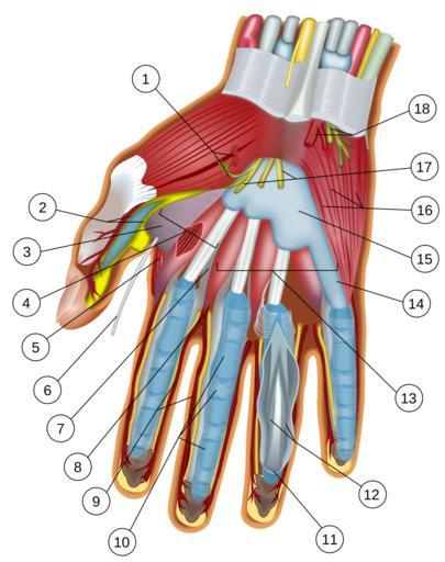| Keywords: Wrist and hand deeper palmar dissection-numbers.svg The hands med /lat manus pl manūs are the two intricate prehensile multi-fingered body parts normally located at the end of each arm of a human or other primate They are the chief organs for physically manipulating the environment using anywhere from the roughest motor skills wielding a club to the finest threading a needle ; and since the fingertips contain some of the densest areas of nerve endings on the human body they are also the richest source of tactile feedback For this reason the sense of touch is intimately associated with human hands Like other paired organs eyes ears legs each hand is dominantly controlled by the opposing brain hemisphere and thus handedness or preferred hand choice for single-handed activities such as writing with a pen reflects a significant individual trait hidden Key Superficial palmar branch of radial artery and recurrent branch of median nerve to thenar muscles Proper palmar digital nerves of thumb Fascia over adductor pollicis muscle Thenar space deep to flexor tendons and 1st lumbrical muscle 1st dorsal interosseous muscle Probe in dorsal extension of thenar space deep to adductor pollicis muscle Septum separating thenar from midpalmar space Common palmar digital artery Proper palmar digital arteries and nerves Annular and cruciform parts of fibrous sheath over synovial flexor tendon sheaths Insertion of flexor digitorum profundus tendon Insertion of flexor digitorum superficialis tendon Midpalmar space deep to flexor tendons and lumbrical muscles 5th finger synovial tendinous sheath Common flexor sheath ulnar bursa Hypothenar muscles Common palmar digital branches of median nerve Ulnar artery and nerve left left Die Hände med /lat manus pl manūs sind zwei komplexe zum Greifen geeignete Körperteile mit mehreren Fingern die normalerweise am Ende jedes Armes eines Menschen oder eines Affen sind Sie sind die Hauptorgane um die Umwelt physisch zu beeinflussen sei es um grob- oder feinmotorische Fähigkeiten auszuüben Da die Fingerspitzen viele Nervenenden beinhalten sind sie auch eine der Hauptquellen für den Tastsinn Aus diesem Grund wird der Tastsinn direkt mit den Händen assoziiert Wie andere paarweise vorkommende Organe z B Augen Ohren Beine wird jede Hand hauptsächlich von der gegenüberliegenden Hirnhälfte kontrolliert hidden Schlüssel Superficial palmar branch of radial artery and recurrent branch of median nerve to thenar muscles Proper palmar digital nerves of thumb Fascia over adductor pollicis muscle Thenar space deep to flexor tendons and 1st lumbrical muscle 1st dorsal interosseous muscle Probe in dorsal extension of thenar space deep to adductor pollicis muscle Septum separating thenar from midpalmar space Common palmar digital artery Proper palmar digital arteries and nerves Annular and cruciform parts of fibrous sheath over synovial flexor tendon sheaths Insertion of flexor digitorum profundus tendon Insertion of flexor digitorum superficialis tendon Midpalmar space deep to flexor tendons and lumbrical muscles 5th finger synovial tendinous sheath Common flexor sheath ulnar bursa Hypothenar muscles Common palmar digital branches of median nerve Ulnar artery and nerve left left Las manos son dos intrincadas partes del cuerpo humano prensiles y con cinco dedos cada una localizadas normalmente en los extremos de los antebrazos Abarcan desde la muñeca hasta la yema de los dedos de los humanos Son el principal órgano para la manipulación física del medio La punta de los dedos contienen algunas de las zonas con más terminaciones nerviosas del cuerpo humano son la principal fuente de información táctil sobre el entorno por eso el sentido del tacto se asocia inmediatamente con las manos Como en los otros órganos pares ojos oídos piernas cada mano está controlada por el hemisferio del lado contrario del cuerpo Siempre hay una dominante sobre la otra la cual se encargará de actividades como la escritura manual de esta forma el individuo podrá ser zurdo si la predominancia es de la mano izquierda siniestra o diestro si es de la derecha diestra ; este es un rasgo personal de cada uno hidden Key Rama superficial Palmar de la arteria radial y periódica rama del nervio mediano a músculos tensados Palmar digital de nervios del pulgar Fascia sobre el músculo aductor pollicis Espacio tenar profundidad a los tendones flexores del primer músculo lumbrical 1er músculo interóseo dorsal Probe en extensión dorsal de tenar espacio profundo para el músculo aductor pollicis Septo tenar que separa el espacio de midpalmar Arteria digital palmar común Arterias digitales palmares y nervios Anular cruciforme y partes de la vaina fibrosa sinovial y tendón flexor vainas Arteria ulnar y los nervios Digital palmar común de las ramas del nervio mediano Músculos Hipotenar Vaina del flexor común ulnar bursa 5to dedo de la mano sinovial de vaina tendinosa Espacio midpalmar flexor profundo a los tendones y los músculos lumbrical Inserción del tendón flexor digitorum superficialis Inserción del tendón flexor digitorum profundus left left Les mains du latin manus pl manūs sont deux organes complexes et préhensiles situés à l'extrémité des bras des primates et munis de doigts Elles sont les principaux organes utilisés pour saisir et manipuler des objets pris dans l'environnement de la façon la plus brutale brandir un gourdin à la plus fine enfiler une aiguille L'extrémité des doigts contient l'une des plus forte concentration de terminaisons nerveuses du corps humain ce qui fait de la main l'un des organes principaux du sens du toucher Comme pour d'autres organes allant par paires comme les yeux ou les oreilles chaque main est principalement contrôlé par l'hémisphère opposé du cerveau La main utilisée préférentiellement est l'aspect le plus visible de la latéralisation de chaque individu hidden Légende Palmar branche superficielle de l'artère radiale et la br