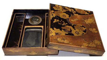 Keywords: Writing box, Edo period, 17th century, water caltrop and seashell design in maki-e lacquer - Tokyo National Museum - DSC05132.JPG en Lacquerware exhibit in the Tokyo National Museum Tokyo Japan This artwork is old enough so that it is in the public domain 2013-09-02 21 26 59 own Daderot PD-100 cc-zero Edo lacquerware in the Tokyo National Museum Uploaded with UploadWizard Maki-e |