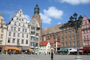 Keywords: Wroclaw-marketsquare-elizabethschurch-011.JPG Poland Wroclaw market square with St Elizabeth ™s Church own 2007-05 Myriam Thyes public domain 51 6 37 9 N 17 1 53 3 E heading 320 Block of buildings on west side of Market Square in WrocÅ‚aw