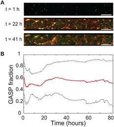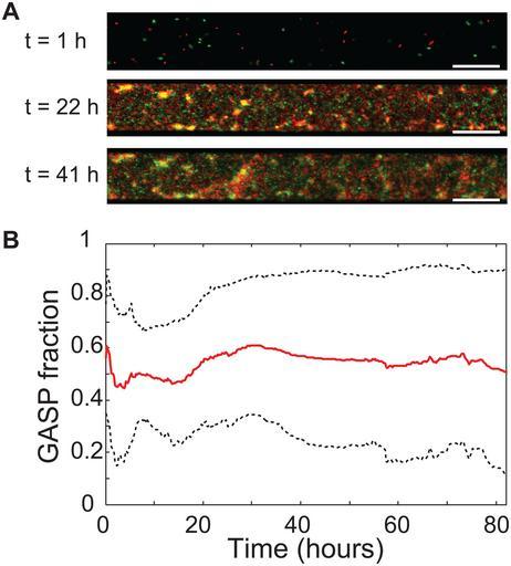 Keywords: WT GASP on chip.jpg en WT and GASP E coli coexist in a single-patch habitat a Microscopy pictures showing a section of a habitat consisting of a single patch 8500×100×15 micrometer at three time-points the white bar indicates 50 micrometer WT green and GASP red cells develop into a structured community Initially t 1 hour planktonic cells colonize the habitat a day later many multi-cellular aggregates have formed The composition of these aggregates indicated by their color changes over time b GASP fraction through time of microhabitats consisting of a single patch with a volume equal to the total volume of an 85-patch microhabitat Mean of experiments red solid line black dashed lines indicate the mean the standard deviation doi 10 1371/journal pone 0077042 g005 2014-01-27 23 59 52 http //www plosone org/article/info 3Adoi 2F10 1371 2Fjournal pone 0077042 Felix J H Hol Peter Galajda Krisztina Nagy Rutger G Woolthuis Cees Dekker Juan Keymer cc-zero Uploaded with UploadWizard Uncategorized 2014 January 28 |