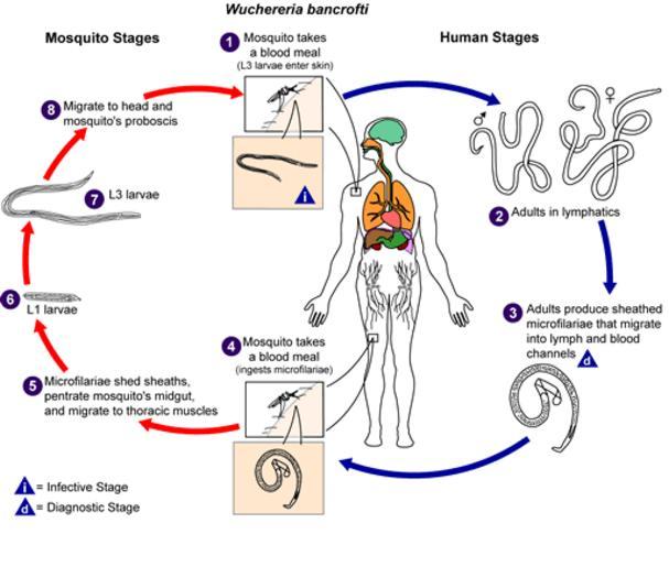 | Keywords: Wucheria bancrofti LifeCycle.gif Wuchereria bancrofti Life cycle of Wuchereria bancrofti Different species of the following genera of mosquitoes are vectors of W bancrofti filariasis depending on geographical distribution Among them are Culex C annulirostris C bitaeniorhynchus C quinquefasciatus and C pipiens ; Anopheles A arabinensis A bancroftii A farauti A funestus A gambiae A koliensis A melas A merus A punctulatus and A wellcomei ; Aedes A aegypti A aquasalis A bellator A cooki A darlingi A kochi A polynesiensis A pseudoscutellaris A rotumae A scapularis and A vigilax ; Mansonia M pseudotitillans M uniformis ; Coquillettidia C juxtamansonia During a blood meal an infected mosquito introduces third-stage filarial larvae onto the skin of the human host where they penetrate into the bite wound They develop in adults that commonly reside in the lymphatics The female worms measure 80 to 100 mm in length and 0 24 to 0 30 mm in diameter while the males measure about 40 mm by 1 mm Adults produce microfilariae measuring 244 to 296 μm by 7 5 to 10 μm which are sheathed and have nocturnal periodicity except the South Pacific microfilariae which have the absence of marked periodicity The microfilariae migrate into lymph and blood channels moving actively through lymph and blood A mosquito ingests the microfilariae during a blood meal After ingestion the microfilariae lose their sheaths and some of them work their way through the wall of the proventriculus and cardiac portion of the mosquito's midgut and reach the thoracic muscles There the microfilariae develop into first-stage larvae and subsequently into third-stage infective larvae The third-stage infective larvae migrate through the hemocoel to the mosquito's prosbocis and can infect another human when the mosquito takes a blood meal http //www dpd cdc gov/dpdx/images/ParasiteImages/A-F/Filariasis/W_bancrofti_LifeCycle gif PD-USGov Filariasis Wuchereria bancrofti CDC lifecycles Parasitic life cycles of nematodes |