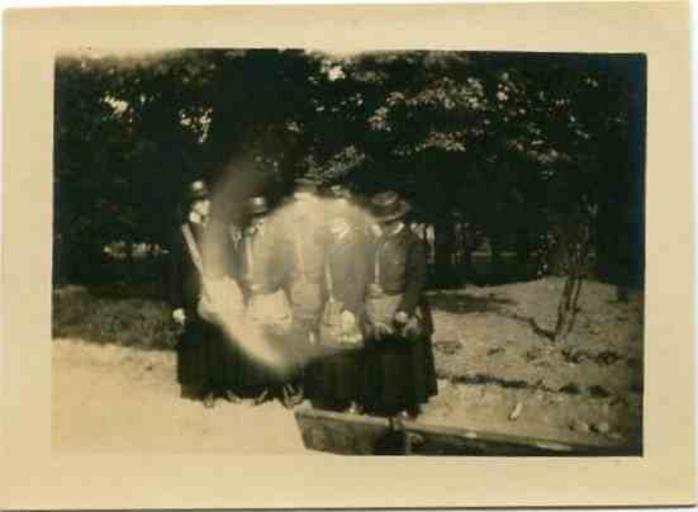Keywords: base hospital no. no 65 Overexposed snapshot of four unidentified U.S. Army female nurses and a male Army member with leather bags, posing outside along a row of trees in a park during World War I. Those pictured are believed to be members of Base Hospital No. 65 (undated). From Ione B. Bain Papers, WWI 61, WWI Papers, Military Collection, State Archives of North Carolina, Raleigh, N.C. Overexposed snapshot of four unidentified U.S. Army female nurses and a male Army member with leather bags, posing outside along a row of trees in a park during World War I. Those pictured are believed to be members of Base Hospital No. 65 (undated). From Ione B. Bain Papers, WWI 61, WWI Papers, Military Collection, State Archives of North Carolina, Raleigh, N.C. |