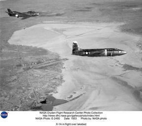 | Keywords: X-1A in flight over lakebed DVIDS739014.jpg en The Bell Aircraft Corporation X-1A 48-1384 returning from an Air Force test flight over Edwards Air Force Base California in late 1953 A North American F-86A Sabre as chase plane will follow the X-1A to touchdown The Rogers Dry Lake is the whitish area under the planes with the airfield at the edge of the dry lake Bell test pilot Jean Skip Ziegler made six flights between 14 February and 25 April 1953 Air Force test pilots Maj Charles Chuck Yeager and Maj Arthur Kit Murray made 18 test flights between 21 November 1953 and 26 August 1954 NACA test pilot Joseph Walker made one successful flight on 20 July 1955 During a second flight attempt on 8 August 1955 an explosion damaged the aircraft shortly before launch Walker unhurt climbed up into the JTB-29A mothership and the X-1A was jettisoned over the Edwards AFB bombing range There were five versions of the Bell X-1 rocket-powered research aircraft that flew at the NACA High-Speed Flight Research Station Edwards California The bullet-shaped X-1 aircraft were built by Bell Aircraft Corporation Buffalo N Y for the U S Army Air Forces after 1947 U S Air Force and the National Advisory Committee for Aeronautics NACA The X-1 Program was originally designated the XS-1 for EXperimental Sonic The X-1's mission was to investigate the transonic speed range speeds from just below to just above the speed of sound and if possible to break the sound barrier Three different X-1s were built and designated X-1-1 X-1-2 later modified to become the X-1E and X-1-3 The basic X-1 aircraft were flown by a large number of different pilots from 1946 to 1951 The X-1 Program not only proved that humans could go beyond the speed of sound it reinforced the understanding that technological barriers could be overcome The X-1s pioneered many structural and aerodynamic advances including extremely thin yet extremely strong wing sections; supersonic fuselage configurations; control system requirements; powerplant compatibility; and cockpit environments The X-1 aircraft were the first transonic-capable aircraft to use an all-moving stabilizer The flights of the X-1s opened up a new era in aviation The first X-1 was air-launched unpowered from a Boeing B-29 Superfortress on Jan 25 1946 Powered flights began in December 1946 On Oct 14 1947 the X-1-1 piloted by Air Force Captain Charles Chuck Yeager became the first aircraft to exceed the speed of sound reaching about 700 miles per hour Mach 1 06 and an altitude of 43 000 feet The number 2 X-1 was modified and redesignated the X-1E The modifications included adding a conventional canopy an ejection seat a low-pressure fuel system of increased capacity and a thinner high-speed wing The X-1E was used to obtain in-flight data at twice the speed of sound with particular emphasis placed on investigating the improvements achieved with the high-speed wing These wings made by Stanley Aircraft were only 3 3/8-inches thick at the root and had 343 gauges installed in them to measure structural loads and aerodynamic heating The X-1E used its rocket engine to power it up to a speed of 1 471 miles per hour Mach 2 24 and to an altitude of 73 000 feet Like the X-1 it was air-launched The X-1 aircraft were almost 31 feet long and had a wingspan of 28 feet The X-1 was built of conventional aluminum stressed-skin construction to extremely high structural standards The X-1E was also 31 feet long but had a wingspan of only 22 feet 10 inches It was powered by a Reaction Motors Inc XLR-8-RM-5 four-chamber rocket engine As did all X-1 rocket engines the LR-8-RM-5 engine did not have throttle capability but instead depended on ignition of any one chamber or group of chambers to vary speed The X-1A X-1B and the X-1D were growth versions of the X-1 They were almost five feet longer almost 2 500 pounds heavier and had conventional canopies The X-1A and X-1B were modified to have ejection seats Their mission was to continue the X-1 studies at higher speeds and altitudes The X-1A began this research after the X-1D was destroyed in an explosion on a captive flight before it made any research flights On Dec 12 1953 Major Charles Yeager flew the X-1A up to a speed of 1 612 miles per hour almost two-and-a-half times the speed of sound Then on Aug 26 1954 Major Arthur Murray took the X-1A up to an altitude of 90 440 feet Those two performances were the records for the X-1 program Later the X-1A was also destroyed after being jettisoned from the carrier aircraft because of an explosion The X-1B was fitted with 300 thermocouples for exploratory aerodynamic heating tests installed on it It also was the first aircraft to fly with a reaction control system a prototype of the system used on the X-15 The X-1C was cancelled before production All three of the Bell Aircraft Company-manufactured planes had 6 000-pound-thrust XLR-11 four-chambered rocket engines The XLR-11 was built by Reaction Motors Inc The aircraft were all air-launched from a carrier aircraft NASA Identifier NIX-E-2490 2009-09-23 Glenn Research Center https //www dvidshub net/image/739014 739014 2012-10-18 00 30 WASHINGTON DC US PD-USGov Aircraft at Rogers Dry Lake Images from DoD uploaded by Fæ Bell X-1 North American F-86 Sabre |