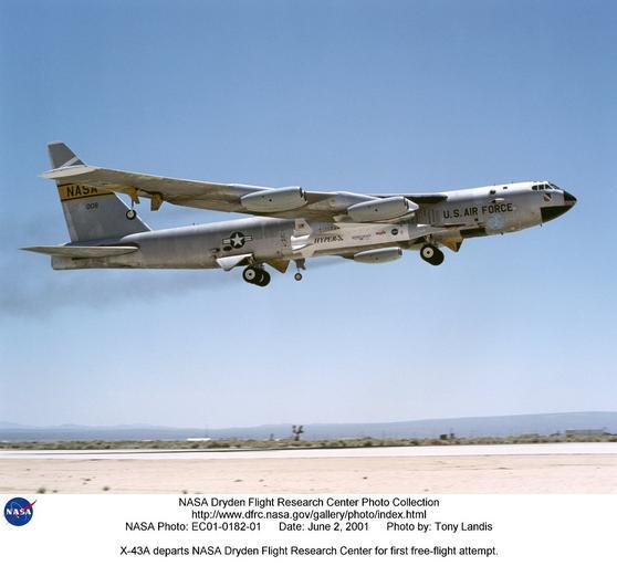 | Keywords: X-43A departs NASA Dryden Flight Research Center for first free-flight attempt. DVIDS729056.jpg en The first X-43A hypersonic research aircraft and its modified Pegasus booster rocket were carried aloft by NASA's NB-52B carrier aircraft from Dryden Flight Research Center at Edwards Air Force Base Calif on June 2 2001 for the first of three high-speed free flight attempts About an hour and 15 minutes later the Pegasus booster was released from the B-52 to accelerate the X-43A to its intended speed of Mach 7 Before this could be achieved the combined Pegasus and X-43A stack lost control about eight seconds after ignition of the Pegasus rocket motor The mission was terminated and explosive charges ensured the Pegasus and X-43A fell into the Pacific Ocean in a cleared Navy range area A NASA investigation board is being assembled to determine the cause of the incident Work continues on two other X-43A vehicles the first of which could fly by late 2001 Central to the X-43A program is its integration of an air-breathing scramjet engine that could enable a variety of high-speed aerospace craft and promote cost-effective access to space The 12-foot unpiloted research vehicle was developed and built for NASA by MicroCraft Inc Tullahoma Tenn The booster was built by Orbital Sciences Corp at Chandler Ariz The X-43A flights are the first actual flight tests of an aircraft powered by a scramjet engine capable of operating at hypersonic speeds above Mach 5 or five times the speed of sound Some 90 minutes after takeoff the Pegasus will launch from a B-52 rocketing the X-43A to Mach 7 at 95 000 feet altitude or Mach 10 at 105 000 feet altitude The X-43A will be powered by its revolutionary air-breathing supersonic-combustion ramjet or scramjet engine The X-43A will then fly a pre-programmed trajectory conducting aerodynamic and propulsion experiments as it descends until it splashes into the Pacific Ocean NASA Identifier NIX-EC01-0182-01 2009-09-23 Glenn Research Center https //www dvidshub net/image/729056 729056 2012-10-17 15 25 WASHINGTON DC US PD-USGov Aircraft at Edwards Air Force Base Images from DoD uploaded by Fæ Boeing X-43 NASA NB-52B |