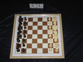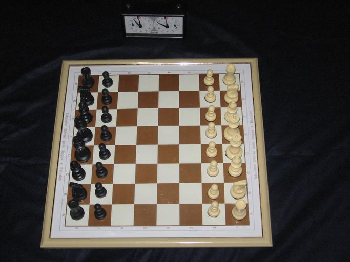 | Keywords: Xadrez inicial 2.jpg  A sample of official size chess pieces in the starting position on a board with algebraic notation markings A chess clock is nearby own 2007-03-14 Luis Dantas Chess sets Files by User Luis Dantas Taken with Canon PowerShot A520 |