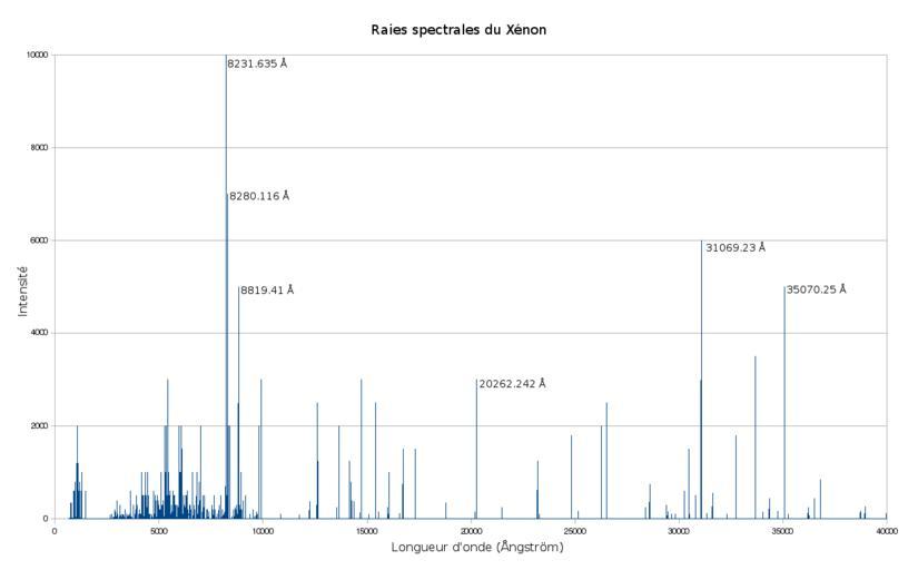 | Keywords: Xenon Raies spectrales.png fr Raies spectrales du Xénon Créé avec OpenOffice org Calc Bless et The Gimp d'après http //www hbcpnetbase com/ Handbook of Chemistry Physics own Epop 2008-06-25 Check categories 2008 November 28 fr wikipedia Xénon Xenon Xenon |