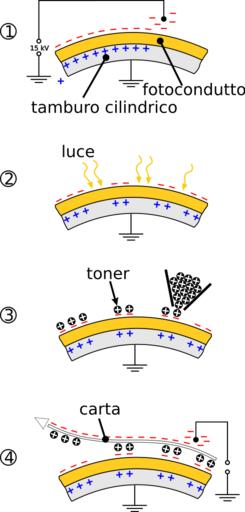 Keywords: Xerographic photocopy process it.svg it wikipedia 2016 August 14 Schematic drawing of the xeroxgraphic photocopying process Vectorization of the image Original image made by 'Wschneider' on the German Wikipedia Charging The surface of a cylindrical drum is given an electrostatic charge by either a high voltage wire called a corona wire or a charge roller The drum is coated with a photoconductive material A is a semiconductor that becomes conductive when exposed to light Exposure A bright lamp illuminates the original document and the white areas of the original document reflect the light onto the surface of the photoconductive drum The areas of the drum that are exposed to light those areas that correspond to white areas of the original document become conductive and therefore discharge to ground The area of the drum not exposed to light those areas that correspond to black portions of the original document remain negatively charged The result is a latent electrical image on the surface of the drum Developing The toner is positively charged When it is applied to the drum to develop the image it is attracted and sticks to the areas that are negatively charged black areas just as paper sticks to a toy balloon with a static charge Transfer The resulting toner image on the surface of the drum is transferred from the drum onto a piece of paper with a higher negative charge than the drum Desen schematic al procesului fotocopierii xerografice Versiune vectorizată imagine originală realizată de către Wschneider pe Wikipedia în limba germană Încărcare Suprafeţei unui tambur îi este atribuită o sarcină electrostatică fie de către un cablu de înaltă tensiune numit cablu corona fie de către o rolă de încărcare sau de developare Tamburul este învelit într-un material fotoconductiv zona galbenă din imagine adică un semiconductor care devine conductiv atunci când este expus la lumină Expunere O lampă puternică iluminează documentul original iar zonele albe ale acestuia reflectă lumina pe suprafața tamburului fotoconductiv Zonele expuse la lumină ale tamburului devin conductive și prin urmare se descarcă la pământ Zonele neexpuse la lumină ale tamburului acelea corespunzătoare porțiunilor negre ale documentului original rămân încărcate negativ Rezultatul este o imagine electrică latentă pe suprafața tamburului Developare Imaginea din pigment rezultată pe suprafața tamburului este transferată de pe acesta pe o foaie de hârtie cu o sarcină negativă mai mare decât cea a tamburului Transfer Pigmentul este topit și fixat pe hârtie de către role presante încinse traduzione da http //en wikipedia org/wiki/File Xerographic_photocopy_process_en svg 2007 2009 Yzmo Scriban wikipedia it Scriban Original upload log it wikipedia Xerographic+photocopy+process+it svg wikitable - 2009-04-29 08 57 850×1779× 132004 bytes Scriban traduzione da http //en wikipedia org/wiki/File Xerographic_photocopy_process_en svg Photocopiers |
