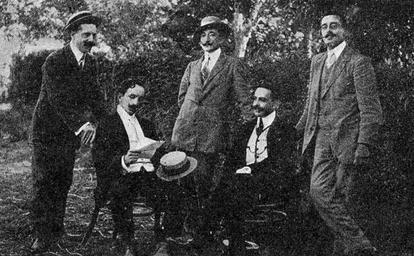| Keywords: Xornalistas, escritores e artistas en Ferrol 1909.jpg gl Xornalistas escritores e artistas en Ferrol fotografía en Vida Gallega 1909 <br /><br /><center>De esquerda a dereita </center><br /><br /><center>Eduardo Sánchez Miño Vicente Díaz González Wenceslao Fernández Flórez Joaquín Arias de Miranda e José Fitor Cabot </center> 1909 http //galiciana bibliotecadegalicia xunta es Galiciana Vida Gallega 11-1909 p 34 other versions Custom license marker 2016 06 30 PD-Scan PD-old-80 Journalists from Galicia Spain Male writers from Galicia Spain |