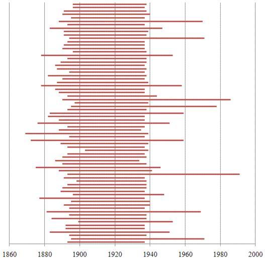 Keywords: XVII съезд ВКП (б).GIF en Life durations of members of Central Committee chosen on the 17th Congress of the All-Union Communist Party Bolsheviks ru Годы жизни членов Цент ального Комитета ВКП б изб анных XVII съездом Данные из Википедии п едставленные в виде г афика ихаил Дво кин 2009-11-28 1934 Bar charts |