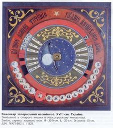 Keywords: Лунно-солнечный календарь XVIII.jpg ru Изоб ажение лунно-солнечного календа я вто ой половины XVIII века железо де ево ка тон масло; H - 35 5 см L- 25 см D диск - 15 см Календа ь найден у ста ого козака в ежиго ском монасты е севе нее Киева Этот календа ь экспони уется в Днеп опет овском исто ическом музее им Д И Яво ницкого century 18 https //plus google com/photos/115842773887585232135/albums/5123396857050563873/5123398441893496114 banner pwa pid 5123398441893496114 oid 115842773887585232135 plus google com author PD-Art-100 Uploaded with UploadWizard Slavic folk calendar in Ukraine Mezhyhirya Monastery Items of Ukrainian Cossacks Dnipropetrovsk Historical Museum