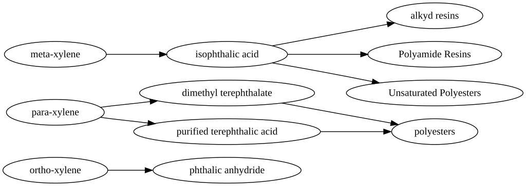 | Keywords: Xylene chemical production network.svg Petrochemical Produced using Graphviz Source code is below <pre>digraph G rankdir LR ortho-xylene -> phthalic anhydride para-xylene -> dimethyl terephthalate dimethyl terephthalate -> polyesters para-xylene -> purified terephthalic acid purified terephthalic acid -> polyesters meta-xylene -> isophthalic acid isophthalic acid -> alkyd resins isophthalic acid -> Polyamide Resins isophthalic acid -> Unsaturated Polyesters </pre> own Mr3641 2010-10-25 Xylene Chemical processes |