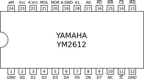 | Keywords: Yamaha YM2612 pinout.svg  Pinout of the Yamaha YM2612 IC chip Adobe Illustrator Valid SVG File Yamaha YM2612 pinout gif 2010-04-16 Original User Ben Boldt / Vector Fred the Oyster File Yamaha YM2612 pinout gif Electronic components Images created by Fred the Oyster |