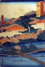 Keywords: Yamashiro Province, The Togetsu Bridge in Arashiyama (5765889316).jpg en <b>Accession Number </b> 1957 256 <b>Display Artist </b> Utagawa Hiroshige <b>Display Title </b> Yamashiro Province The Togetsu Bridge in Arashiyama <b>Series Title </b> Famous Views of the Sixty-odd Provinces <b>Suite Name </b> Rokujuyoshu meisho zue <b>Creation Date </b> 1853 <b>Medium </b> Woodblock <b>Height </b> 13 1/2 in <b>Width </b> 9 1/8 in <b>Display Dimensions </b> 13 1/2 in x 9 1/8 in 34 29 cm x 23 18 cm <b>Publisher </b> Koshimuraya Heisuke <b>Credit Line </b> Bequest of Mrs Cora Timken Burnett <b>Label Copy </b> One of Series Rokuju ye Shin Meisho dzu View of 60 or More Provinces Published by Koshei kei in 1853-1856 Included in this collection are 3 duplicates This print depicts the Togetsu Bridge over the Hozu River with a waterfall cascading down a cloudy Mount Arashi The village of Arashiyama to the west of Kyoto has served as inspiration for many Japanese artists The place has not only been depicted by many famous printers but is also considered the birthplace of Japanese literature <b>Collection </b> http //www sdmart org/art/our-collection/asian-art The San Diego Museum of Art 2007-12-19 15 14 03 https //www flickr com/photos/thesandiegomuseumofartcollection/5765889316/ Flickr en thesandiegomuseumofartcollection PD-old-100 Art of Japan in the San Diego Museum of Art |