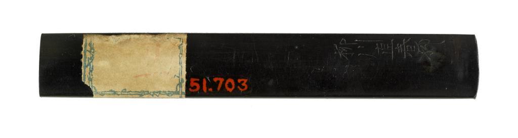 Keywords: Yanagawa Naoharu - Kozuka with Treasure Ship ("Takara-bune") of the Gods of Good Fortune - Walters 51703 - Back.jpg All the items on the ship are treasures associated with the seven gods of good fortune From right to left are the key to the gods' storehouse the god Daikoku's hammer bails of hay sacred jewels on the sail an inexhaustible money bag and a hat that makes the wearer invisible The artist signed this kozuka on the reverse late Other date century 18 Edo shakudo gold gold alloy and silver cm 9 6 accession number 51 703 21102 Henry Walters Baltimore date and mode of acquisition unknown Walters Art Museum Henry Walters Acquired by Henry Walters Signature Yanagawa Naoharu place of origin Edo present-day Tokyo Japan Walters Art Museum license Tosogu Japanese sword fittings in the Walters Art Museum Media contributed by the Walters Art Museum needs category review Yanagawa Naoharu