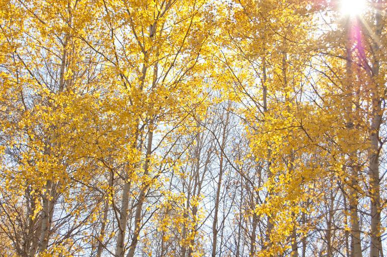 Keywords: yellow trees autumn the sun shines through the leaves clear day blue sky