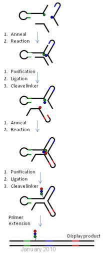 | Keywords: Yoctoreactor library assembly wiki2.TIF en Figure 2 Stepwise assembly of a DEL library using YoctoReactor technology A 3-way reactor is shown here a Position 1 P1 and P2 BB are brought into close proximity and undergo a chemical reaction in the presence of a helper oligonucleotide in P3 b The structure is purified by polyacrylamide gel electrophoresis PAGE the P1 and P2 DNA is ligated and the P2 linker is cleaved c P3 BB is annealed to the P1-P2 ligation product from step b and a chemical reaction between P2 and P3 BBs takes place d The reaction product is purified by PAGE the DNA is ligated and P3 linker is cleaved yielding a compound OOO covalently attached to the folded yR e The yR is dismantled by primer extension yielding a double-stranded disply product exposing the reaction product for selection and molecular evolution own Viptrh 2010-05-21 Biochemistry |
