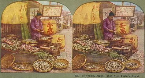 Keywords: YokohamaShellFishDealer.jpg Yokohama Japan Shell Fish Dealer's Stand Scanned from a period stereoptical view card c 1900 No listing of publisher date nor assertion of any copyright Text on reverse YOKOHAMA JAPAN SHELL FISH DEALER'S STAND The Japanese take three meals a day Much the same food is partaken of at all these meals but breakfast is lighter thant he other two The staple is rice with fish and eggs which are plentiful and minute portions of vegetables either fresh or pickled especially beans Buddhism left its imprint here as on everything in Japan To Buddhism was due the abaondonment of a meat diet now over a thousand years ago The permission to eat fish though that too entailed taking of life which is contrary to strict Buddhist tenents seems to have been a concession to human frailty Pious frauds moreover came to the rescue One may even now see the term mountain whale yama-kujira written up over certain eating-houses which means venison The logis is this A whale is a fish; fish may be eaten; therefore if you call venison mountain whale you can eat it No actual prohibion against eating flesh such as existed under the old regime obtains now but the custom of abstaining from it remains pretty general The coasts of Japan abound in fish and shellfish of all descriptions and of excellent quality PD-old Shellfish Markets in Japan Stereo cards of Yokohama Concession stands |