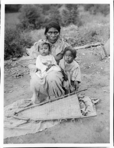 Photograph of the Yokut Indian wife and two children of the chief at the Tule River Reservation, near Porterville, California, ca.1900. She crouches on a blanket on the ground outside with a baby sitting in her lap and an older child standing to her left. A woven triangular construction (a small travois?) lays on the ground in front of them. Brush and a few trees grow in the background.