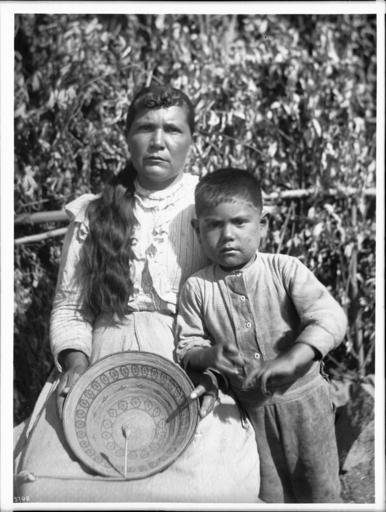 ''Yokut Indian women basket maker and her son home from school, Tule River Reservation near Porterville, California, ca.1900