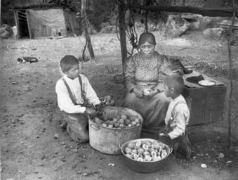 Photograph of a Yokut Indian women and two boys preparing peaches, Tule River Reservation near Porterville, California, ca.1900. They sit outside -- she on a chair or stool, they on the ground -- with two large metal tubs of peaches between them. One contains whole peaches, the other pitted peach halves. The surrounding ground is littered with peach pits. A round tin lid, a hat, and a blanket or clothing sit on a large wooden box behind the woman. A dog sleeps on the ground at left behind the group. In the background at left is a boxy native dwelling consisting of wooden frame and tarps.