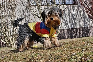 Keywords: yorkshire dog pets puppies ball outfit garden shrubs house