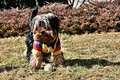 Keywords: yorkshire dog pets puppies ball outfit garden shrubs