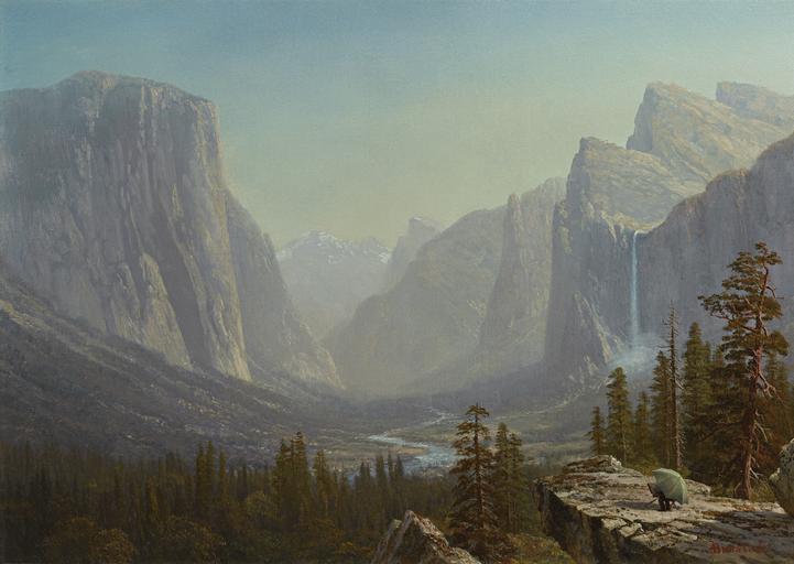 | Keywords: Yosemite by Albert Bierstadt, c1875.jpg ~ 1875 Oil on canvas in 20 28 place of discovery object history exhibition history credit line signed A Bierstadt lower right Inspired by the spectacular and unspoiled wilderness he encountered in the American West Albert Bierstadt set out to record the landscape for posterity focusing on the natural wonders of the largely unexplored and undocumented territories of Yosemite the High Sierras and Yellowstone He was among the first American painters to capture the grandeur and natural splendor of the region and to record the many atmospheric moods of its climate and terrain Upon first casting eye over Yosemite Valley in 1863 Bierstadt proclaimed We are now here in the garden of Eden I call it The most magnificent place I was ever in and I employ every moment painting from nature quoted in Eleanor Jones Harvey The Civil War and American Art Washington D C 2012 p 62 The interpretation of the divine spirit Bierstadt found in the mountain valleys of the western panorama characterized the depictions of Yosemite he produced thereafter and he completed his first large-scale rendering in 1865 Looking Down Yosemite Valley California Birmingham Museum of Art Birmingham Alabama He would continue to take the dramatic topography as a subject for years to come becoming more closely associated with the place than perhaps any other artist Painted circa 1875 Yosemite Valley brilliantly captures the monumentality and majesty of the place on an intimate scale Bierstadt would travel to Yosemite twice more in 1872 and 1873 and Gordon Hendricks comments on the fervid stimulation Bierstadt drew from the remote location In Yosemite the artist made studies for some of his most attractive inspired works ABierstadt Fort Worth Texas 1972 p 19 Yosemite Valley superbly demonstrates Bierstadt ™s translation of the Hudson River School formula to the rugged verticality of the West The high vantage point crystalline quality of light and tranquility of the scene are reminiscent of Sanford Robinson Gifford ™s A Gorge in the Mountains Kauterskill Clove 1863 The Metropolitan Museum of Art New York Yet the rugged topography sets Yosemite Valley apart from the eastern landscapes of Bierstadt ™s peers and reveals a different type of sublime In the present work the viewer is overcome by a sense of discovery as the West appears to be opening itself up the river leading the eye back into the scene through the valley past El Capitan on the left and Cathedral Rocks on the right beyond the spray of Bridalveil Fall to the distant snowy peak of Half Dome It is as if one has stumbled upon a hidden valley “a pristine paradise The composition gives the viewer the sense of having entered into hallowed ground a sacred space where nature is all powerful Here man represented by the lone figure painting on a rocky outcropping is overwhelmed by yet at peace with nature This painting also contains a rare self-portrait by Bierstadt who painted as such under an umbrella from the time he was a student in Düsseldorf in the 1850s Bierstadt set out to record the American landscape focusing on the natural wonders of these largely unexplored and undocumented regions His idealized interpretations of the West were in keeping with the image of the frontier held by many who would never travel there and his paintings were highly sought-after by patrons willing to pay record prices for his spectacular canvases Bierstadt ™s paintings of Yosemite held out the promise of a New Eden a place in which all Americans could slough off the trauma of war and sectarian strife a place of renewal and healing Eleanor Jones Harvey The Civil War and American Art Washington D C 2012 p 60 The present work was most likely owned by Ulysses S Grant the famed general who led the Union troops to victory during the Civil War and became the 18th president of the United States in 1869 Grant and Bierstadt knew one another as earlier as 1877 and are known to have dined together at Delmonico ™s restaurant in 1881 It is appropriate that Grant who in 1872 signed the bill to create the world ™s first national park “ Yellowstone “ would own such a majestic view of Yosemite accession number place of creation http //www sothebys com/en/auctions/ecatalogue/2016/american-art-n09580/lot 55 html Sotheby's PD-old-100 Albert Bierstadt Paintings of Yosemite by Albert Bierstadt |