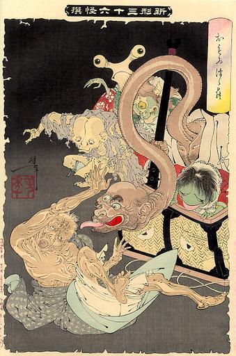 MAKE A MEME View Large Image Yoshitoshi The Heavy Basket.jpg Tsukioka Yoshitoshi The Heavy Basket 1892 From the Thirty-six Ghosts series 9 25 x 14 25 The print depicts a number of monsters attacking an old woman From http //www japaneseprints net/prints cfm ID ...