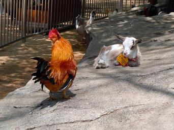 Keywords: young goat domestic fowl cock rooster chickens zoo