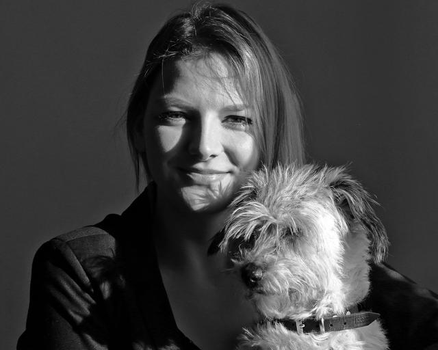 Keywords: young woman dog black and white portrait daughter beautiful sweet smiling happy face