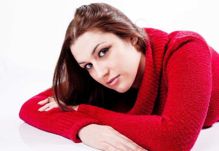 Keywords: young woman female lying down jumper red girl attractive adult people white body one natural