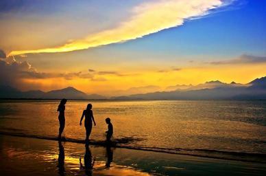 Keywords: beach bikini sunset sand summer sunbeam water surf surface sunlight coast along shore calm red yellow horizon night orange light evening people dusk sun walk clouds relaxing wave dark shiny still reflection