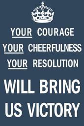 | Keywords: Your Courage, Your Cheerfulness, Your Resolution Will Bring Us Victory.svg en Contemporary rendering of a poster from the United Kingdom reading Your Courage Your Cheerfulness Your Resolution Will Bring Us Victory created during World War II 1939 own based on http //www loudbang co uk/blog/wp-content/uploads/Your_Courage_Poster png photo and File Keep Calm and Carry On Poster svg by Mononomic Vector conversion by Ericmetro The original image is in the public domain and is freely available and the vectorization thereof is hereby also released into the public domain by the author Ericmetro Original poster Template PD-UKGov Vectorization/SVG code Ericmetro See also Wikipedia Keep_Calm_and_Carry_On World War II posters from the United Kingdom Government propaganda SVG posters Derivative works of Keep calm and carry on |
