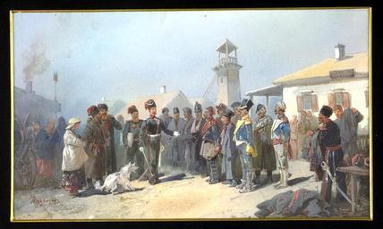 | Keywords: Zachisleniy w kazaki plennych polykov armii Napoleona 1813.jpg ru Зачисление в казаки пленных поляков а мии аполеона 1813 г ru частное соб ание 1881 Ка азин иколай иколаевич PD-old-100 Original upload log ru wikipedia Zachisleniy_w_kazaki_plennych_polykov_armii_Napoleona_1813 jpg wikitable - 2014-12-24 17 48 26761600 2149535 bytes Сто ожевой казак <nowiki> Изоб ажение описание Зачисление в казаки пленных поляков а мии аполеона 1813 г Рисунок Каза ина Иноплеменные п едки нынеш </nowiki> Nikolay Karazin Military of the Russian Empire in art by Nikolay Karazin |