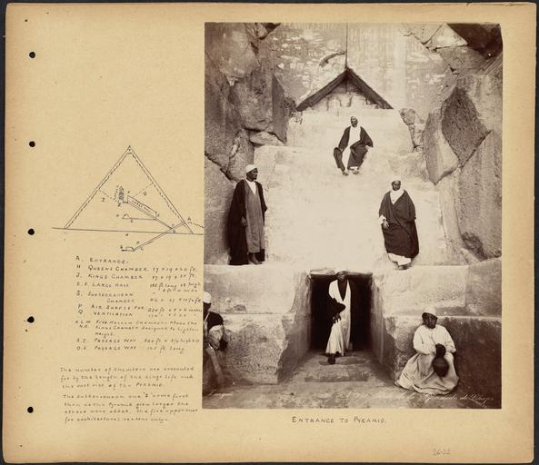 Keywords: Zangaki. 0752. Entrance to Pyramid.jpg Scrapbook page containing an annotated photograph showing six men positioned around the entrance to the Cheops pyramid The page also includes a labeled diagram showing the interior chambers and passageways of the pyramid and their dimensions Subjects Egypt travel photography pyramids tombs Jīzah Ahrāmāt al- group portraits Page size 33 x 38 1 cm Annotations A Entrance- H Queens Chamber 17x19x20 ft J Kings Chamber 17x19x35 ft E F Large hall 155 ft long 28 high 3 ft 4 wide S Subterranean chamber 46x27x10 ½ ft P Air shafts for ventilation 234 ft x 8 x 6 inches Q Ventilation 174 ft x8x6 inches K L M N O Five hollow chambers above the Kings Chamber designed to lighten weight A C Passage way 320 ft x3 ¼ high x4 D E Passage way 125 ft long The number of chambers are accounted for by the length of the King s life and the vast size of the Pyramid The subterranean one S came first then as the pyramid grew longer the others were added the five upper ones for architectural reasons only- Language English photograph has French title Rights No known restrictions Coverage Egypt Notes Title supplied by cataloger derived from captions or annotated information Format Scrapbooks Technique Photographs Albumen prints BPL Department Print Department Photo 1 Photographer Zangaki Constantine Title No 752 Porte de la Pyramide de Cheops Caption Entrance to Pyramid Date ca 1860-1890 Flickr data on 2011-08-03 Camera Sinar AG Sinarback 54 FW Sinar m License CC BY 2 0 User Boston Public Library BPL Flickr http //flickr com/photos/24029425 N06/2468306447 Entrance to Pyramid December 21 1892 March 8 1893 Flickr upload date 2008-05-01 17 11 27 William Vaughn Tupper Flickr uploader http //www flickr com/people/24029425 N06 BPL User Flickr upload bot/upload 17 43 3 August 2011 UTC Fæ CC BY 2 0 PD-old-100 Historical images of Great Pyramid 1890s Entrance of the Great Pyramid of Giza 1890s Tupper Scrapbooks volume 26 Lower Egypt Zangaki Brothers Photos uploaded from Flickr by Fæ using a script Zangaki Photo Collection |