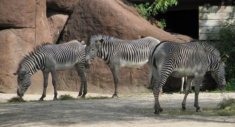 Keywords: zebras mammal three zoo enclosure camouflage herd striped stripes black and white pattern animals outdoors rocks eating standing